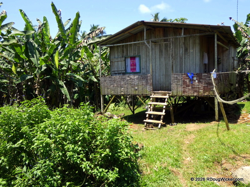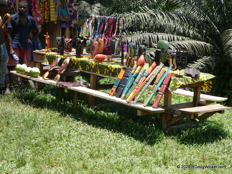 Okay, back on the bus and continuing south along the east coast of São Tomé to Cascata de Praia Pesqueira (Waterfall of Pesqueira Beach). A word of caution: the hike down to the waterfall is steep, slippery, and treacherous, especially for us older folk or, as with Ursula, someone who had recently received a new knee. We got off the bus in a small village with many rustic homes: