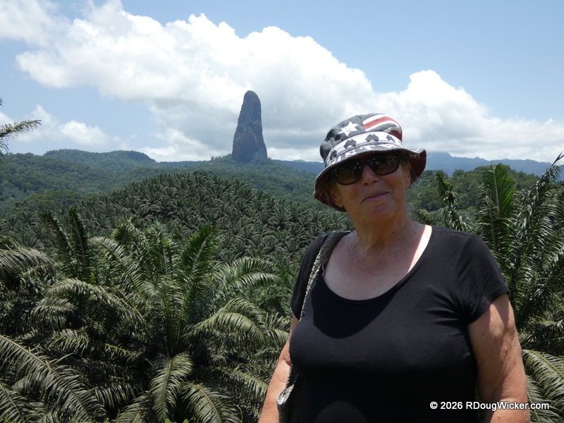 Making our way… carefully… back up the slippery rocks, we once again boarded our tour bus turned inland. Our next destination was perhaps São Tomé’s most iconic feature, Pico Cão Grande (Big Dog Peak). We alighted from the bus at an overlook, whereupon we were greated by the ubiquitous souviner stand: