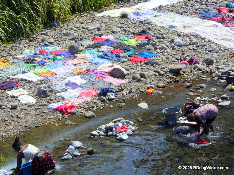 NCL Dawn arrived to the island of São Tomé on 19 March 2025. São Tomé is the principle island of the nation São Tomé and Príncipe. And, as usual, Ursula had us lined up for a tour of this seldom-visited island. On this day we would head out to Abade River, Boca De Inferno (Mouth of Hell), Sete Ondas (Seven Waves) and Micondo Beaches, Cascata (Waterfall) de Praia Pesqueira, Pico Cão Grande (Big Dog Peak), and finally a tour of the city of São Tomé. Whew. I’m tired already, and that’s just from typing out the itinerary for you. How does one small island (330 square miles/ 854 km2 fit in so much to see and do? Let’s begin with Abade River, on which you’ll find women doing their daily clothes washing and using the solar clothes dryer: