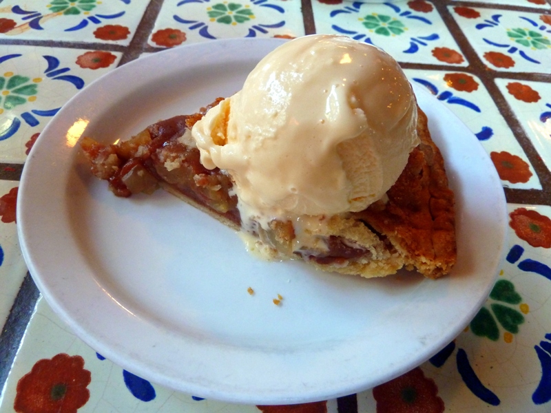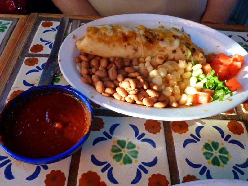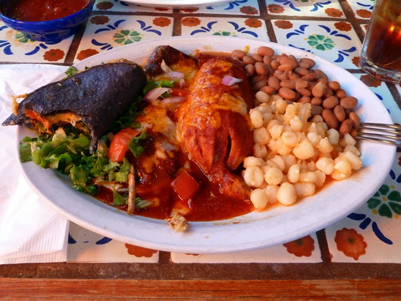 We arrived Wednesday afternoon and, after photographing the magnificent and rather intimidating Rio Grande Gorge, including from atop the unnerving Rio Grande Gorge Bridge (and, yeah, you can feel it shake when traffic goes by), we stopped at Orlando’s for dinner. My entrée was the combination plate—a chicken taco made with a blue corn tortilla, cheese and onion enchilada with red sauce, a New Mexican-style red pork tamale, beans, and posole (hominy cooked in chili sauce). Ursula had the shredded beef chimichanga, beans, and posole served with caribe sauce (a very spicy red sauce made from the entire chili pod, including the seeds and ribs) on the side. Desert for me was apple pie à la mode, while Ursula opted for one of her favorites, the frozen avocado pie.