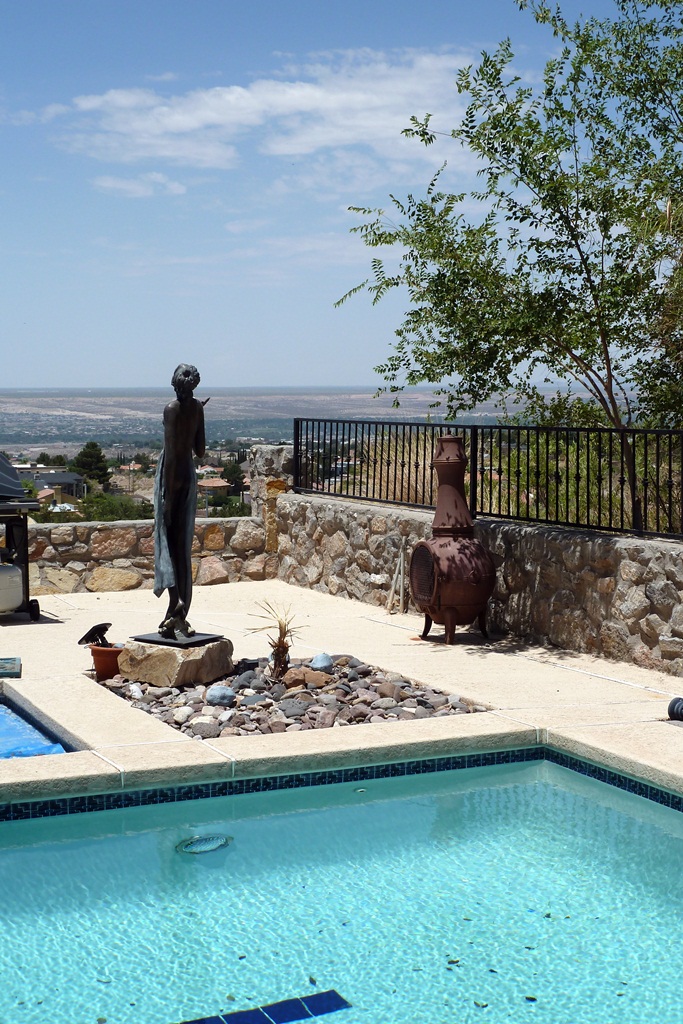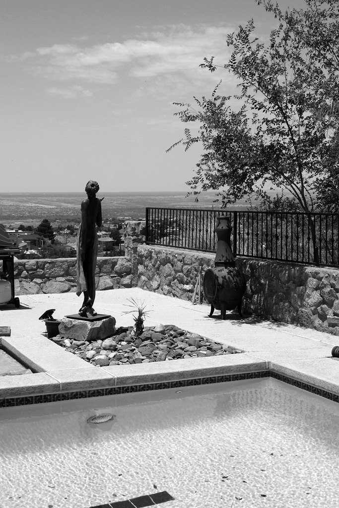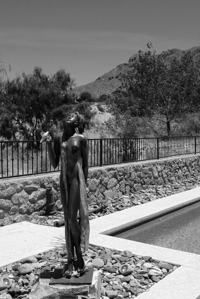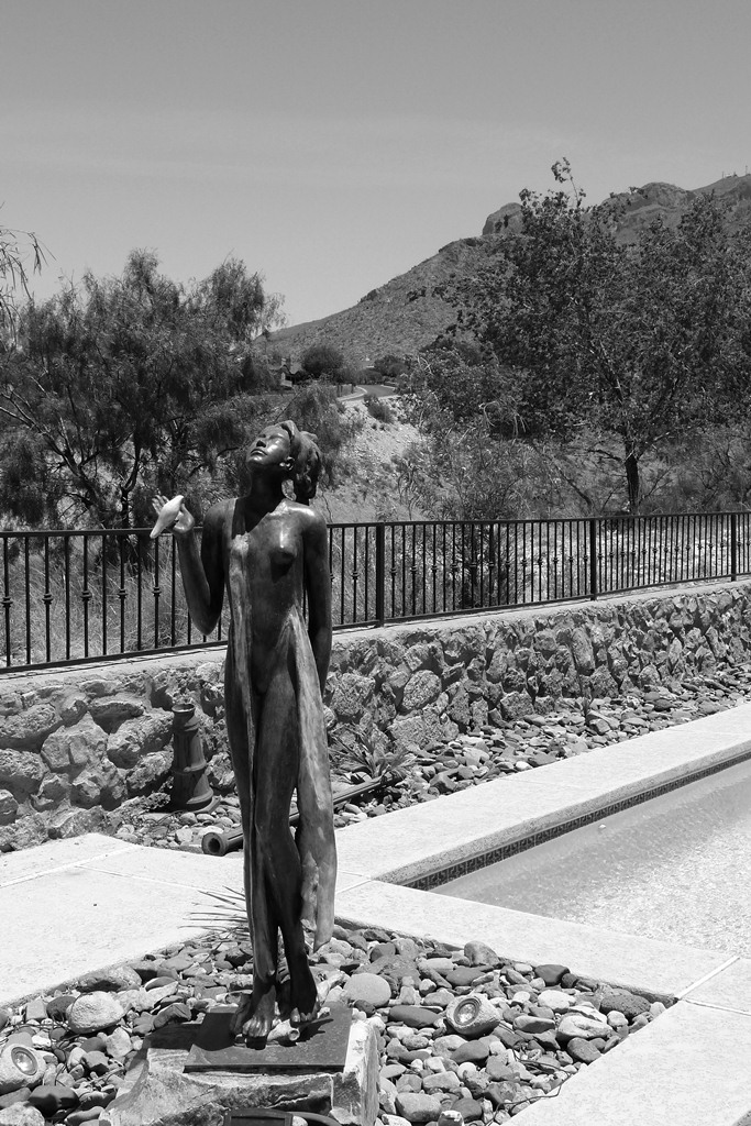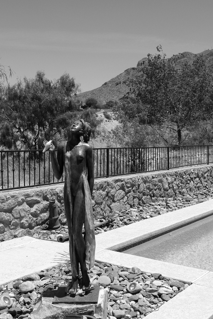 And what are the effects? Take your eyedropper cursor and slide from left to right to find out. As we learned on Wednesday, the B&W filters most often used for landscapes are yellow, orange, and red, and that as you go up that scale anything that was formerly blue or green becomes darker while anything that was previously in the warmer range of colors (yellows, oranges, and reds) will brighten. Thus, if you’re editing a landscape, watch the sky darken and clouds suddenly pop out as you go up the scale from light yellow to red. Green foliage and blue pool water will also darken at the same time. Place the eyedropper over the light green hexagon and the sky lightens and clouds fade. Go to the dark green option and the fainter clouds closer to the horizon will disappear altogether while the water in the pool becomes almost white. If you’re editing a portrait, then you generally want to use the cooler green filters to darken skin tones and increase contrast.