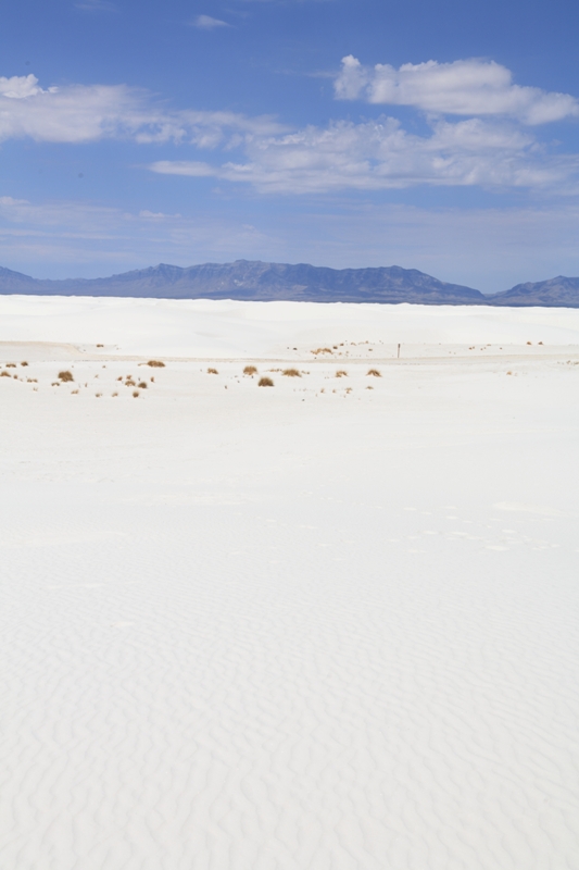 Camera settings for most of these shots included +1 on the exposure compensation, an ISO set to 100, and white balance manually set to sun. Post processing then involved tweaking the tonal curves to bring out details in the gypsum dunes. Oddly enough, on many of these shots that meant bringing down the brightness slightly from the +1 used when the shot was taken, but it worked.