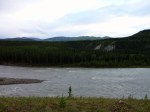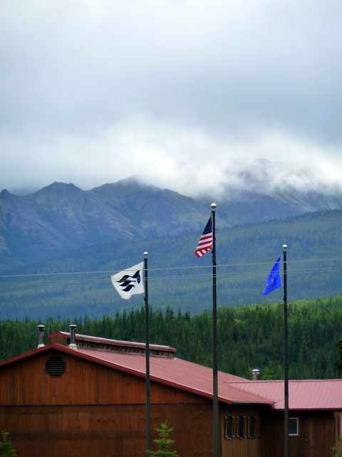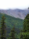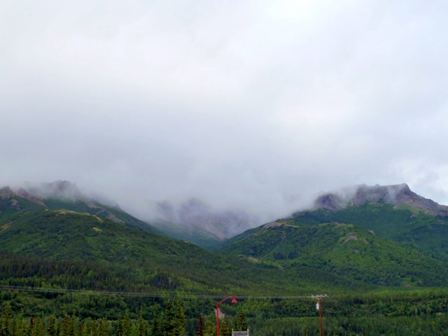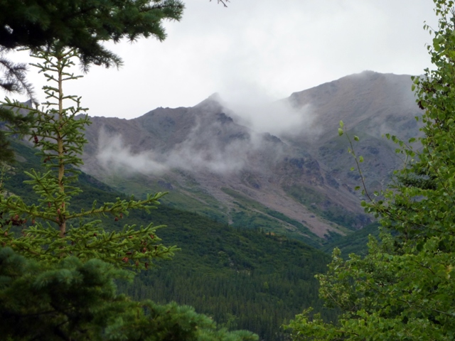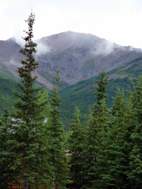 The weather in Healy was the worst we’ve encountered yet on our trip through Alaska. Low clouds shrouded the nearby mountaintops. Rain ranged from nearly constant to merely frequent. Mount McKinley, or Denali as it’s sometimes called, was completely hidden. Nature’s colors were muted beneath the solid overcast and, unfortunately, my pictures reflect that. Despite all that, the trip to Denali National Park and Preserve was a fun one. Along the way we even saw one mama moose and her calf, although I didn’t try to photograph them through the windows of the moving bus.