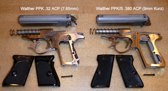 Note the PPK/S has a metal back strap, increasing weight, whereas the PPK has plastic grips that together join to form a back strap as they wrap around the back of the frame.