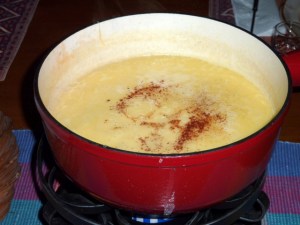 This is quite true. The trick is to make sure it doesn’t scorch too much. We’ve replaced our old fired clay fondue pot with an enameled metal one, and that seems to spread the heat much more effectively. Since making the switch, that scorched piece comes out so much better!