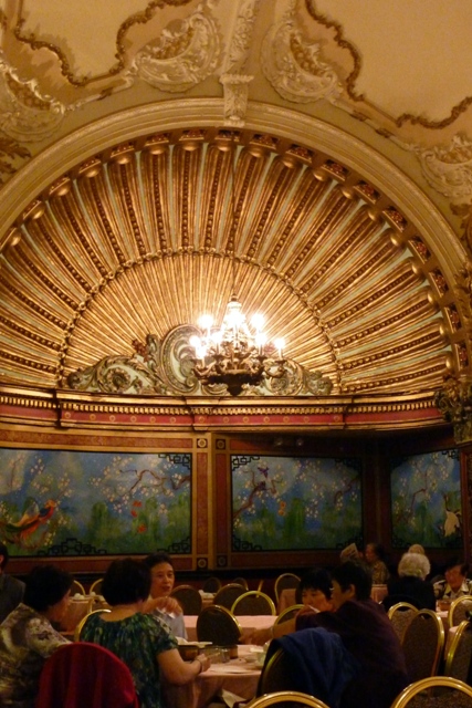 First, we’ll get some Chinese for lunch. Ursula and I fell in love with the dim sum concept on our trip to Hong Kong back in the mid ’90s. So, it’s a great day when we find anything even approaching a good dim sum establishment here in the U.S. The Empire Garden at 690 Washington Street us just such a place. Situated inside an old, restored theater, the dining area is not only huge, it’s also extremely ornate. Myriad dim sum carts are wheeled around the tables, their human propulsion ever on the lookout for a patron signalling them over. These waiters are ever-patient, politely taking the time to explain the various offerings in the individual bamboo steam trays or beneath the smallish metallic domes. Choose wisely, because you’ll fill up for too quickly while wishing you still had room as even more deletable looking delights waft on by.