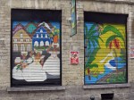 Wandering through the back streets of Brussels, Ursula and I continued to find colorful reminders of the present interspersed with the architectural wonders of the past. More murals greeted us amongst ancient façades—smiling young men strolling through the air above the streets of Brussels. We saw the metal shutters of loading bays decorated in Caribbean themes. Nearby were apartment mailboxes painted in startling yellow and decorated with peacocks, parrots, plants, and pussy cats.