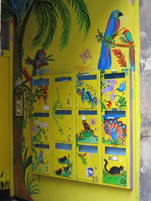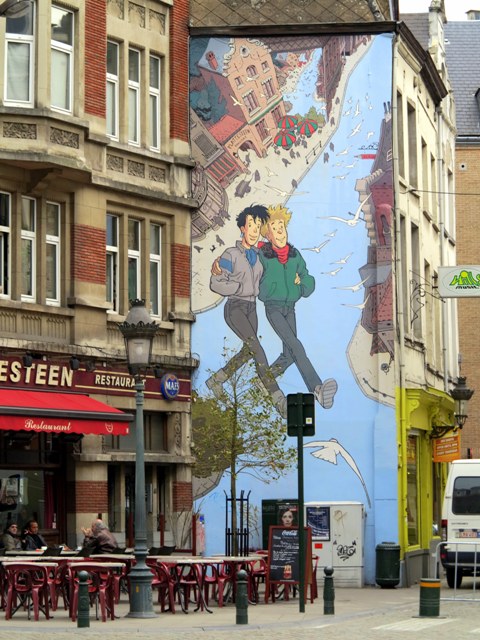 Wandering through the back streets of Brussels, Ursula and I continued to find colorful reminders of the present interspersed with the architectural wonders of the past. More murals greeted us amongst ancient façades—smiling young men strolling through the air above the streets of Brussels. We saw the metal shutters of loading bays decorated in Caribbean themes. Nearby were apartment mailboxes painted in startling yellow and decorated with peacocks, parrots, plants, and pussy cats.
