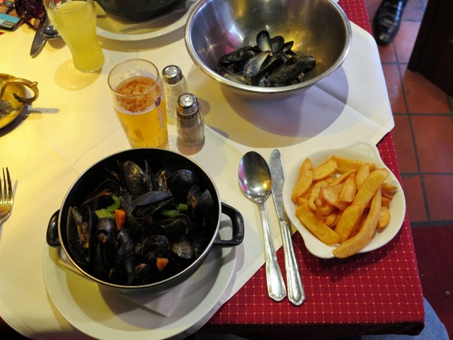 Not all the sights were outside, however. I found an interesting shop lined with unfathomable varieties of Belgian beers. And then there were those hunger-inducing cafés we’d passed earlier, and which now beckoned us with their irresistible siren call to lunch. Lunch in Belgium is synonymous with beer, mussels, and pomme frites and, well, you know the saying—when in Brussels . . . . Entire bill for two, including the beer, a ridiculously low €20 (about $26 U.S.).
