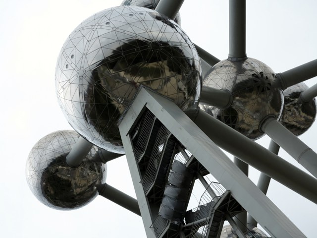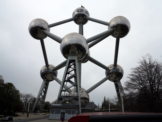 Leaving this neighborhood behind us, we next arrived at the site of the 1958 World’s Fair and that immense monument to the Belgian steel industry, the Atomium. The Atomium is an awe-inspiring set of nine interconnected 18-meter (59-foot) spheres standing some 102 meters (335 feet) high. The structure represents a segment of crystallized iron, with each sphere containing a different exhibit hall or public space (four are currently closed). The tubes connecting the spheres contain escalators, and housed inside the central column upon which the whole thing sits, is an elevator.