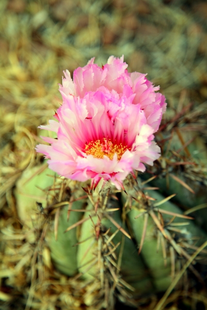 No. It isn’t. Below you will see Desert Sage, Hedgehog Cactii, Yucca, and the exquisite Mexican Bird of Paradise, and a singular cactus flower in our front yard that blooms but once a year.