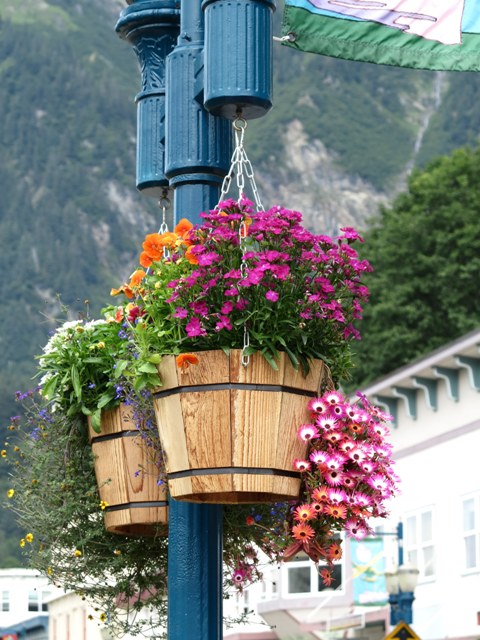 Photographically speaking, save your memory card and camera batteries for Mount Roberts, the steamboat ride, a few shots of your ship (and other ships reflected in the pristine waters), the pretty flowers dotting the streets and hanging from the street lamps, and perhaps the state capital building (which I’ve photographed on previous visits, so you won’t see it today).