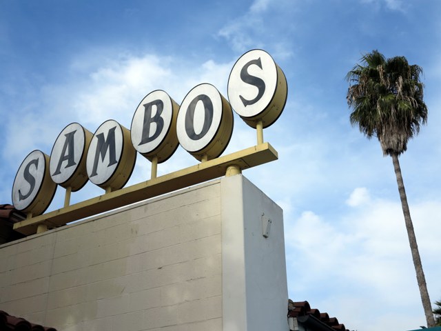 But one of the neatest sights (if you’re old enough to remember them) is both the first and the last remaining Sambo’s family restuarant in the nation — still at its original location at 216 W. Cabrillo Blvd. right across from the beach.  At their peak, Sambo’s had restaurants in 47 states across the U.S.  Today, they’re down to the original one from 1957.  We were going to drop in after our tour of Santa Barbara and before reboarding the Sapphire Princess but, alas, they had closed for the day at a ridiculously early 2:00 P.M.  So, unfortunately, there will be no pictures of the kitschy interior, the bejeweled and turban-clad Indian boy Sambo, and that cutesy tiger.