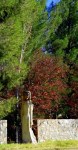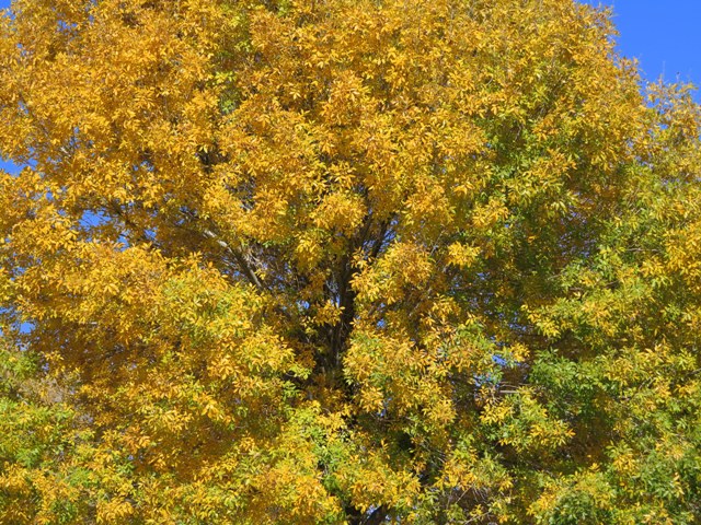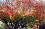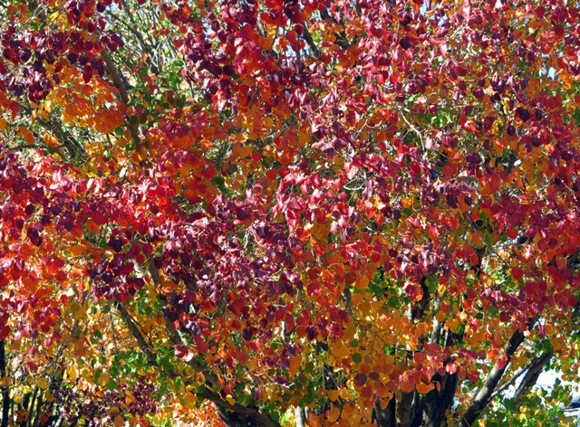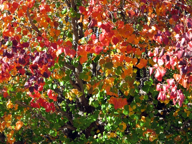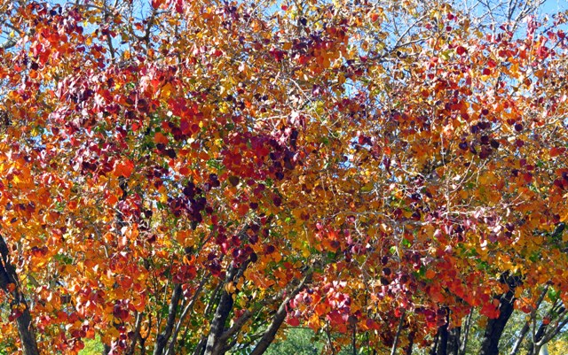 Fall really is the best time of year here in El Paso. Below are today’s fall foliage photos. One rather fun shot is of a statue carved from a large tree trunk, her smiling face framed by the colors of the season as she stands guard at an opening in a low rock wall.