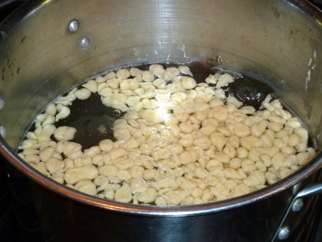 Spaetzle will float to the top when done — about two to three minutes