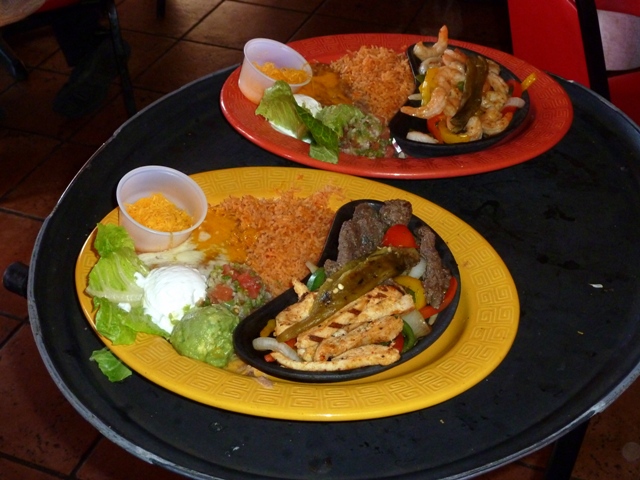 Ursula opted for a chimichanga — a type of deep-fried burrito — stuffed with shredded beef and served with sides of Mexican rice and frijoles (refried beans). She of course doused this chimichanga under a blanket of that aforementioned salsa. Alas, she was a bit disappointed in that the flour tortilla was a bit thick and chewy and overpowered the beef filling.