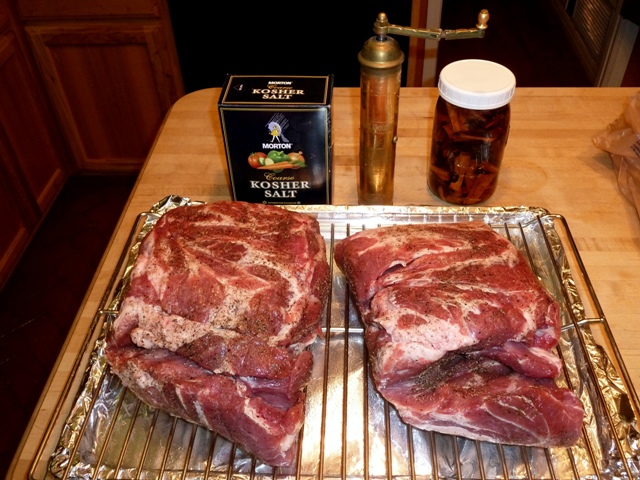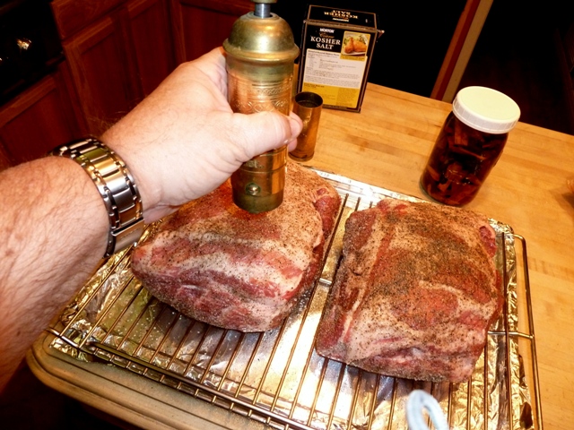 Prepping the pork: Fatty pork takes smoke very easily. As such, I’m of the opinion that less is more when it comes to seasoning these little gems. I also find that garlic (powdered, granulated, crushed, or whole) and other pungent choices clash with the delicate smoke flavor imparted to the meat and quickly overpower the pork itself. Thus, my pork sees only two things before going into the smoker — prodigious amounts of freshly cracked black pepper and coarsely flaked salt (Kosher salt works great for this application despite the irony of “Kosher” and “pork” being used in the same sentence). Coat the entire butt in a fine crust of both. If you’re using a boneless butt then don’t forget to put more salt and pepper inside where the bone once resided. Don’t worry about tying a boneless roast; just fold it together to close off the area exposed by the removal of the bone. Encase the seasoned roasts in plastic wrap and store in the refrigerator for at least two hours, preferably longer.