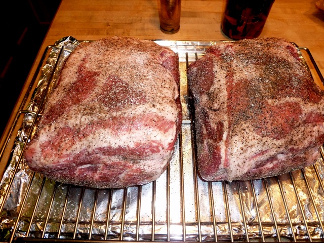 Prepping the rack: Spray vegetable oil onto the rack. Unwrap and place the roasts fat-side-up upon the rack. Sprinkle with more salt and pepper if you lose a lot on the unwrapping, or if the meat appears to have absorbed most of the salt crust. Place the rack near the center of the smoking chamber and insert the digital meat thermometer into the thickest part of the largest roast (if your smoker doesn’t come with this, consider getting one of the newer wireless remote probes that sends a signal to a receiver, or go this route if you have an iThingy: The iGrill).