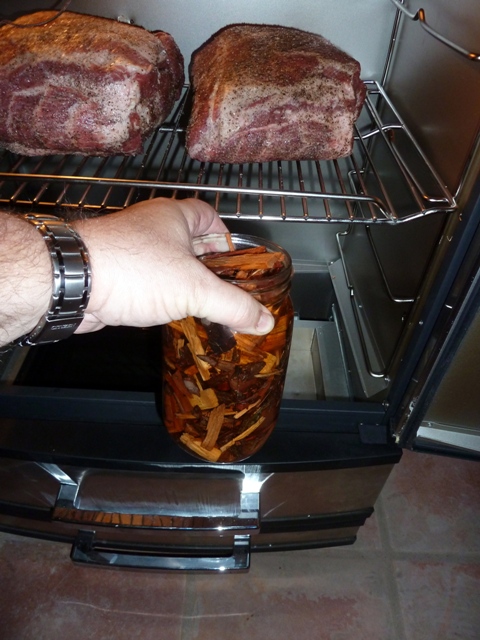 Prepping the smoker: Note: This part assumes that you’ve already seasoned your newly acquired, assembled smoker by heating it to 250° Fahrenheit (120° Celsius) for at least two hours, and that you smoked up the inside with at least a couple of handfuls of chips. If you haven’t, do so now. Fill the water tray per the directions for your smoker (mine calls for leaving about an inch from the top of the tray to avoid spillage when sliding the tray back into the smoker). Place some wood chunks or about a third of the soaked wood chips into the vented smoking box. Position the water tray and smoking box back into the smoker over the heating element. Open the vent atop the smoking chamber to between halfway and fully open erring on the open side. Set the temperature to between 215° and 220° Fahrenheit (102° to 104° Celsius) and the time to around twelve hours.