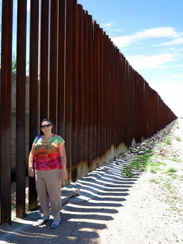 Before hitting Mexico you pass through the Mexico-U.S. Barrier which, in this area, is a series of huge, thick, rusty, solid-steel planks embedded in buried concrete. I posed Ursula beside the structure to give you an idea of its imposing presence as it divides the otherwise magnificent (but no longer “unspoiled”) beauty of the massive Chihuahuan Desert.