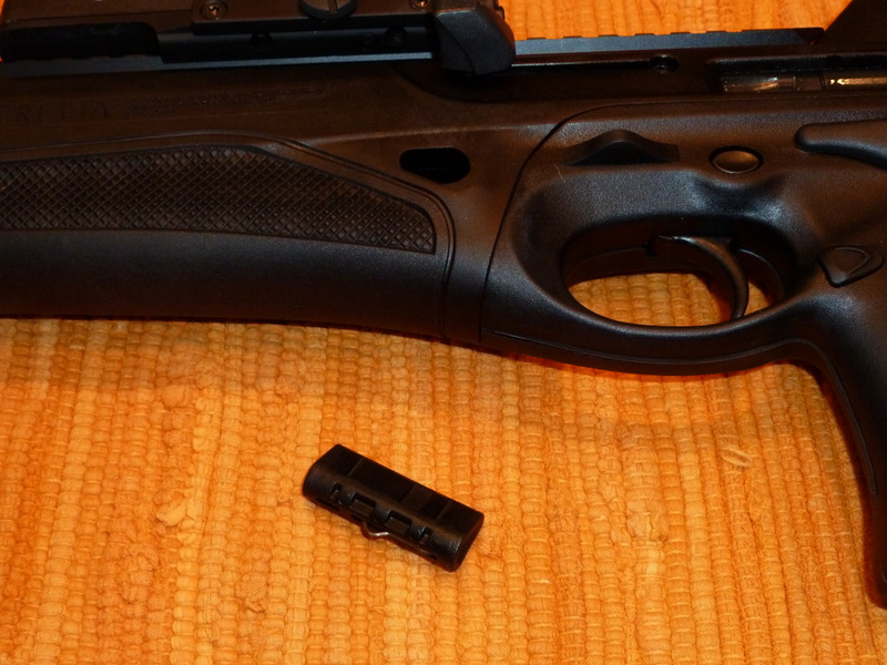 The Cx4 matched to Px4 magazines comes in a hard plastic carrying case with padded top lid, two 17-round Px4 magazines, instruction manual, lock, cleaning rod with attachments, full-length aluminum Picatinny rail along the top, retractable single-notch Picatinny rail that extends from the forestock directly beneath the barrel, and a two-notch Picatinny rail that can be attached to either side of the forestock. A spacer is included to extend the butt by .60 inches (15mm). Additional spacers can be purchased and up to three total can be stacked in place to extend the butt even further. A two-position aperture rear sight gives both long and short ranging options. It’s an impressive kit which, with all the rail options, allows for considerable customization — an optical sight, a laser sight, and even a tactical flashlight can all be attached just with the included hardware.