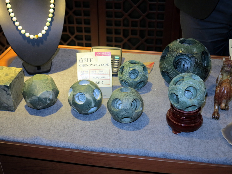 Upon our arrival to this government-owned factory our wonderful China Spree guide Chen “Jim” Mao handed us off to a very knowledgeable host who first showed us the delicate craftsmanship that goes into working jade. By the way, jade is not “carved.” It’s simply too tough. Instead, jade is worked through a delicate and time-consuming abrasion method. The demonstration below shows the incredible work that goes into crafting out of a single block of green jade an intricate, nested series of spheres that all rotate independently of one another once completed.