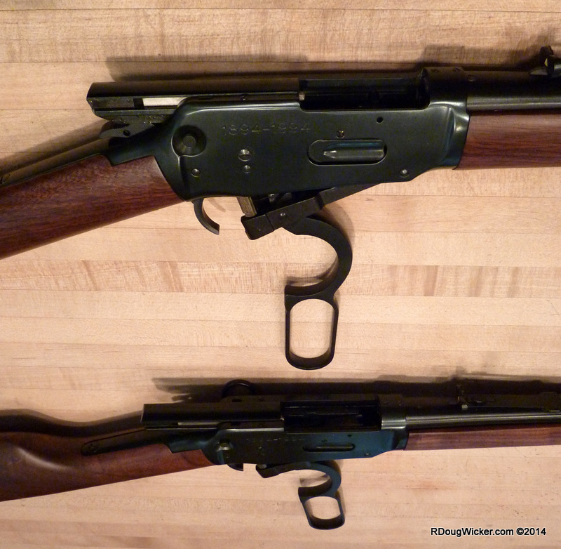 Which brings us to the rifles shown in this weekend’s mini-blog series, the Winchester Model 1894. The Model 1894 is again a John Browning design, but unlike his pistol-caliber Model 1892 this rifle has more in common with his Model 1886 — it’s chambered for rifle rounds. Indeed, the .30-30 was invented with this rifle in mind, and the Model 1894 in that cartridge was for over 100 years the hunting rifle of choice for many deer hunters in the U.S.
