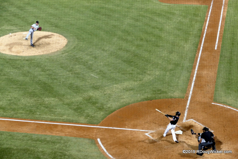 But what if you’re zoomed in on the batter and can’t see when the pitcher is releasing the ball? In this case you have get creative using both eyes. Glue one eye to the viewfinder or LCD screen (viewfinder is better when manually focusing, obviously) while keeping the other eye open and watching the pitcher. This is also a skill you want to acquire in firearms shooting, so it has other applications. Do the both-eyes-open thing and you can get this kind of perfectly timed shot (the ball is the white streak to the upper left and the bat is mildly blurred at the start of the swing):