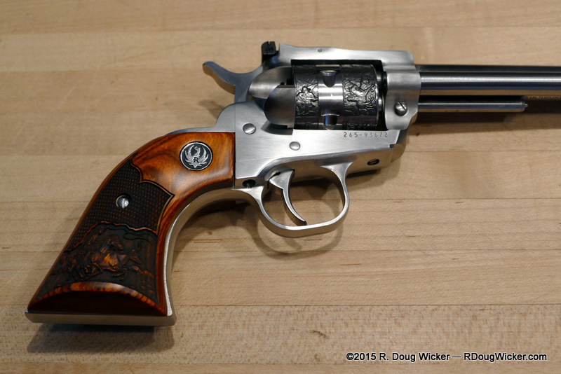 More on the old Single-Six later. Let’s get back to the Talo Exclusive. The model number for this particular exclusive is 0676, and Talo has christened it the Single-Six Cowboy design. It’s easy to see why. I’ll save the details of the multiple scenes engraved on the cylinder for this week’s Fun Photo Friday, but here is a taste of both that engraving and the engraving on the finely crafted wood grips: