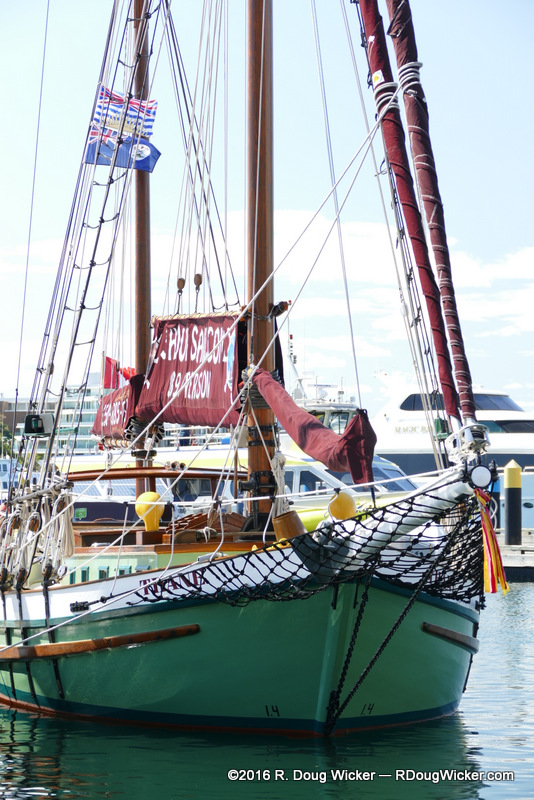 That green ship you see in the foreground is the Thane, and on it is a banner advertising three-hour tours for $89. Makes one wonder if it has a two-man crew, perhaps going by the names of Skipper Jonas Grumby and First Mate Gilligan. Perhaps next time I’ll try this venue. It certainly looks to be a fun ride. Here’s a close-up view of the Thane: