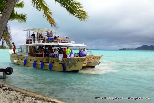 As you can see, the outrigger outran the tour boat on our way to our lagoon lunch. We were waiting ashore as the boat meandered in. Here you can see the tour boat saddling up to a dock: