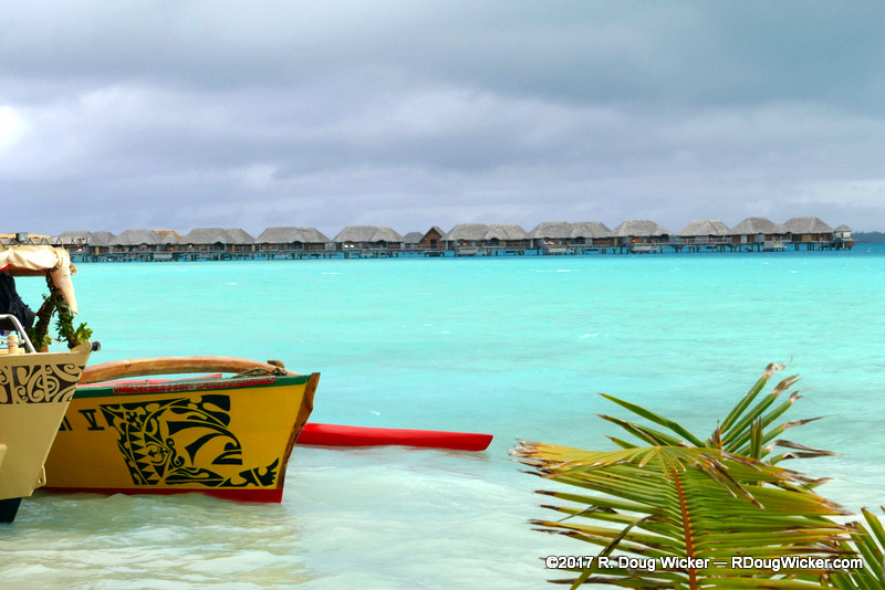 In the distance you can see below one of the many resorts here in which the thatched roof bungalows sit atop stilts over the tropical blue waters: