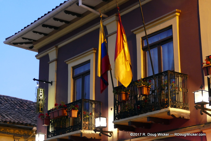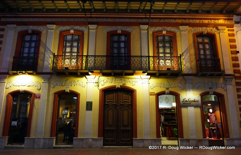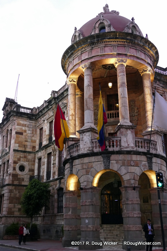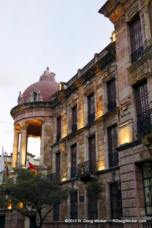 The following picture was taken near the restaurant were we eventually dined that evening. For the following picture I pushed the camera to the limits of the sensor at ISO 800, which is asking a lot from a 1-inch sensor. This is a rather impressive government building on the corner of Simón Bolívar and Presidente Borrero: