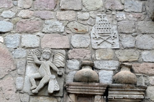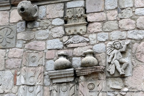 In the parking lot adjacent to the mission were many vendors of clothing, scarves, blankets, and other fabrics made of alpaca. The prices were definitely among the best we’d seen for alpaca so far on the trip, and many on the tour loaded up with some real bargains. But the focus today is on this very old structure. Here are some examples of the intricate stonework that embellishes the façade: