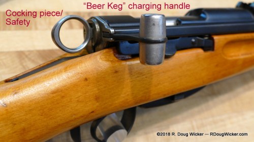 Safety note: The cocking piece can be held while the trigger is pulled, and then gently allowed to travel forward to decock the weapon. Do not do this over a chambered round, as there is no ‘half-notch’ or ‘quarter-notch’ safety built into the K31. Once “decocked”, the firing pin can still protrude through the breech face and make contact with the primer. Only use the cocking piece as a decock over an empty chamber.