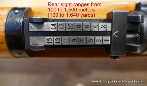 Yes, you read that correctly. Each and every K31 was presented to its operator sighted in at an astounding 300 meters. And the size of the target at 300 meters? The requirement was for the shooter to hit with his first shot a 0.2-meter²/2.15-foot² target! No wonder the Germans never invaded Switzerland. Now, let us take a look at the rear sight, which is calibrated for ranges between 100 meters/109 yards and 1,500 meters/1,640 yards (a mile, by the way, is 1,760 yards!):