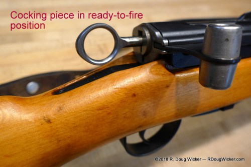 The large ring you see protruding from the back of the bolt is yet another feature. This is the cocking piece. When the ring is vertical and resting against the bolt then the firing pin is not cocked.