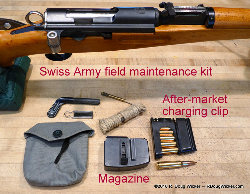 - Swiss Army-issue cleaning kits, muzzle protectors, leather slings, charging clips, and other accessories are readily available online at surprisingly affordable prices. M1918 bayonets with sheaths can also be had, but at upwards of $100 or more for one in good condition.
