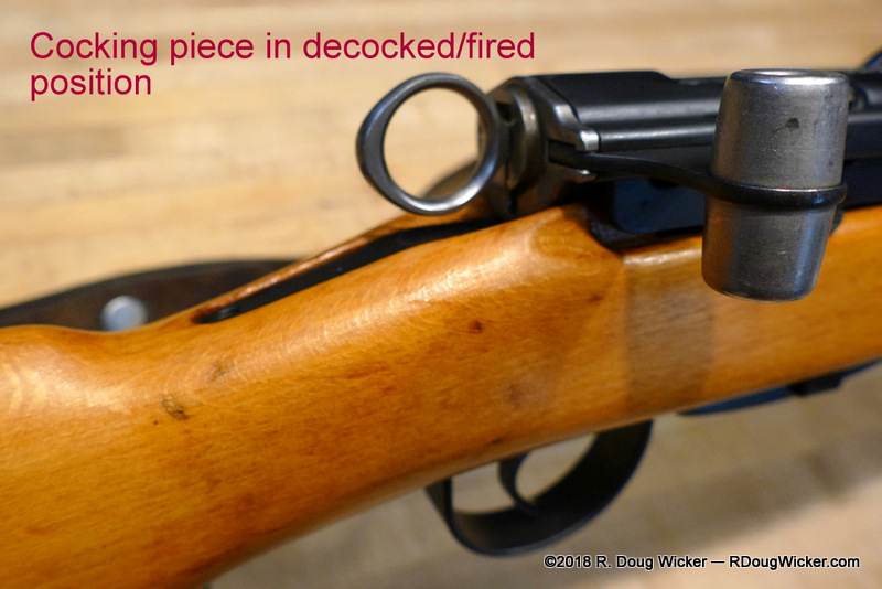 Safety note: The cocking piece can be held while the trigger is pulled, and then gently allowed to travel forward to decock the weapon. Do not do this over a chambered round, as there is no ‘half-notch’ or ‘quarter-notch’ safety built into the K31. Once “decocked”, the firing pin can still protrude through the breech face and make contact with the primer. Only use the cocking piece as a decock over an empty chamber.