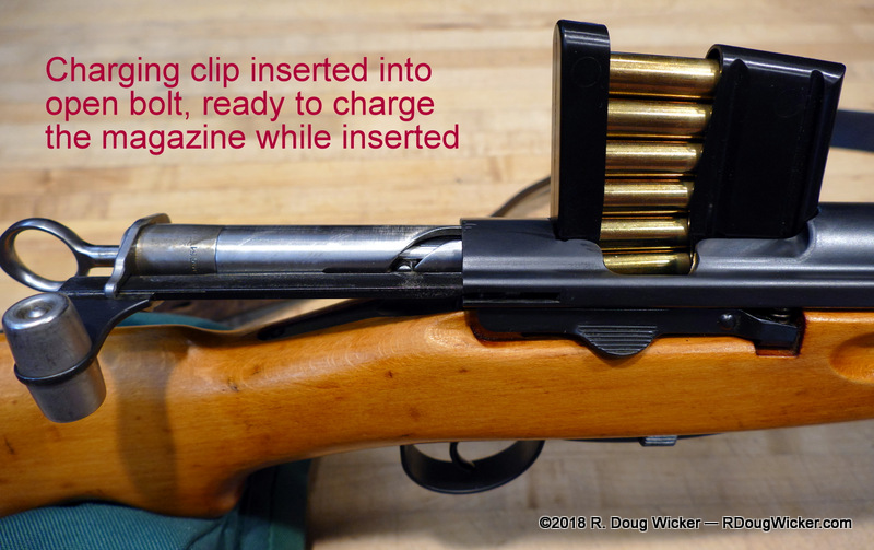 There is, however, a second method of loading the magazine. With the magazine locked into the magazine well and the bolt open, a six-round charging clip can to inserted into the ejection port. The thumb of the right hand then pushes down on the rounds, forcing them into the magazine in one fluid motion. The clip is this removed and tossed aside (the originals were cheap and disposable). Here is a demonstration using an after-market plastic charging clip made specifically for the K31 and the Schmidt-Rubin K11 that preceded the K31: