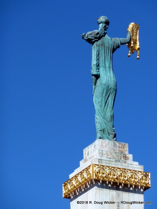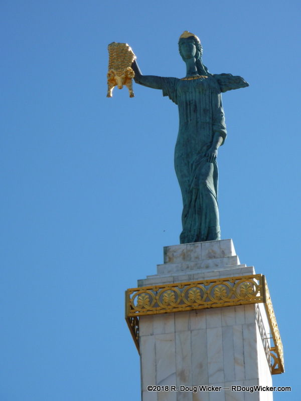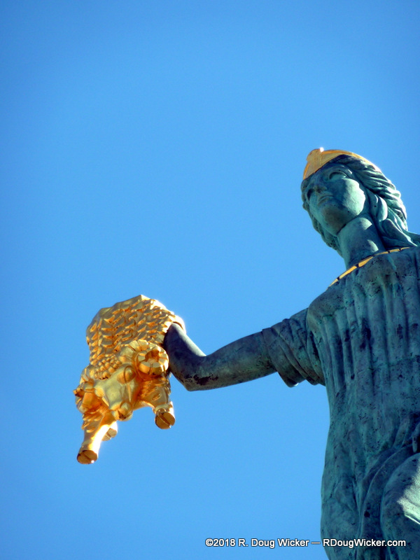 The statue of Medea holding the Golden Fleece stands upon a tall marble pedestal: