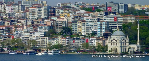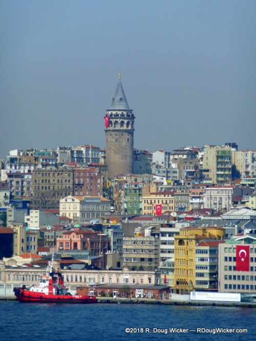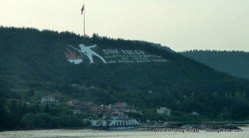 The Dardenelles is not nearly as populated, but it has a history all its own. That’s especially true if you’re from Australia or New Zealand, or if you had anyone who served in ANZAC (Australian and New Zealand Army Corps) during the First World War. It was here that Allied French, British, and ANZAC forces suffered a horrendous defeat and huge casualties during the eleven-month Galipoli Campaign. Several of our fellow passengers from Australia and New Zealand made a pilgrimage to this hallowed ground during our two-day stay in Istanbul several days before. Unfortunately, by the time we were abeam the hillside Dur Yolcu Memorial overlooking Kilitbahir on the Galipoli Peninsula, it was late in the evening and the sun was below the horizon: