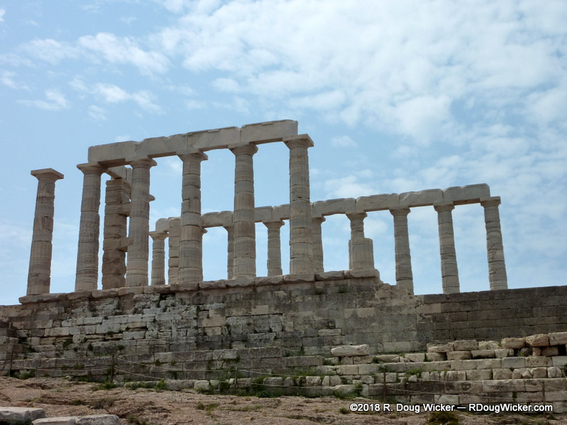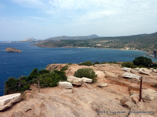 The Temple of Poseidon lies atop a bluff at the southernmost tip of the Attic Peninsula. Up here you are 200 feet/60 meters above the rugged and scenic Aegean coast: