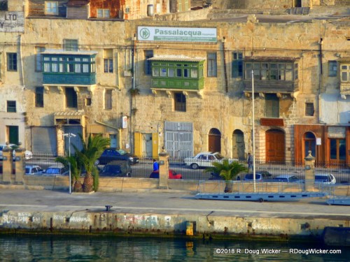 The Valletta Waterfront is but an appetizer to what you’ll find later, but for now let’s just concentrate on this area. Notice above the bright colored doors green rails of the balconies, and multicolored shutters set against the soft yellowed stone masonry. It’s and really fun contrast. In the shot below you’ll see wood-enclosed balconies, which seems to be a feature of the architecture here in Valletta. These balconies are called gallarija(see: Mysteries of the Maltese ‘gallarija’)