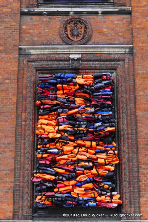 The Kunsthal Charlottenborg is the exhibition home of the Royal Danish Academy of Art, but the wall below is what captured my interest. This piece of wall art is but one frame that uses some 3,500 life jackets from refugees: