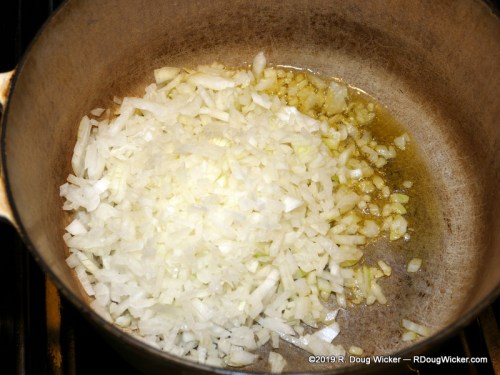 - In a large Dutch oven or skillet, heat up some olive oil and sauté the finely chopped yellow onion until starting to brown.