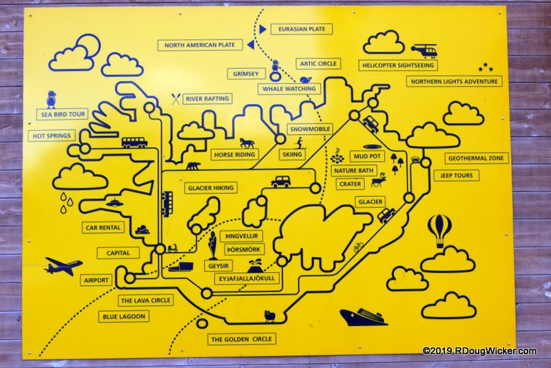 Hanging a right at the Ráðhústorg, and another right onto Skipagata, we quickly came upon a place where we decided to break for lunch. This was Akureyri Fish & Chips. Alas, I didn’t take photos here, but both Ursula and I agree that it was quite good. After a late lunch we started back toward Vision of the Seas, coming across this interesting sign with highlights of Iceland: