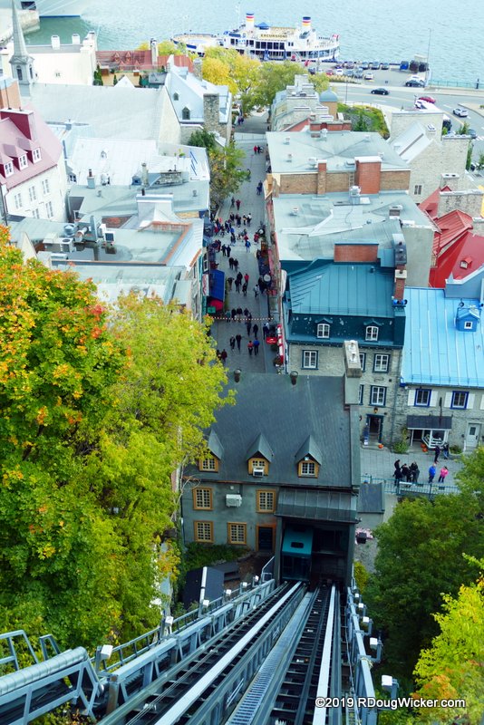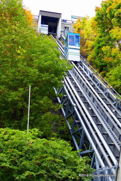 Old Quebec is pretty much two towns in one. Last week we looked mostly at Upper Town. This week we’ll head into Lower Town. And to get there we’re going to take a funicular, which is a railed, counterbalanced transport system used on very steep inclines. Here is the funicular that ties together Upper Town to Lower Town: