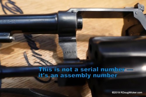 There is one more number stamped on these weapons, but it is not related in any way to the serial number. Again, with the cylinder swung out, look at the frame just below where the pinned barrel is mounted. Here you will find a number that was used internally at Smith & Wesson. The purpose of this number was to assist the craftsmen who handcrafted these works of art. This is an assembly number that assisted in keeping together until final assembly the parts meant for a particular gun: