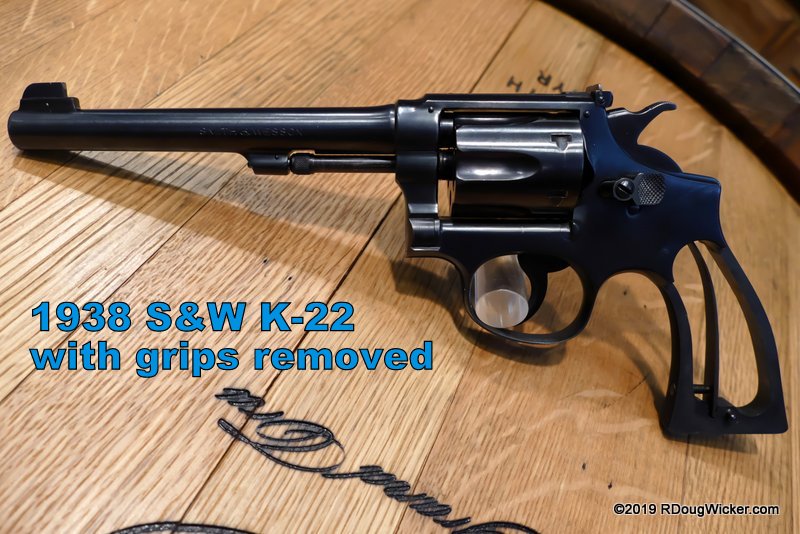 When I first saw this handgun I had an inkling that it was probably prewar because it lacked the ribbed barrel of every postwar K-Frame (medium frame) Smith & Wesson I’ve ever seen. That pencil-thin tapered barrel just looked so elegant compared to the later ribbed barrels. But I wasn’t sure, as the gun was merely tagged for sale as a, “Smith & Wesson .22,” with no further information. So, I went home and did some research, started getting excited when I thought I recognized what it was, called the store for a reading of the serial number, and verified that this was indeed a rare prewar K-22, probably with incorrect grips installed as they lacked the familiar diamond pattern surrounding the screw holes.